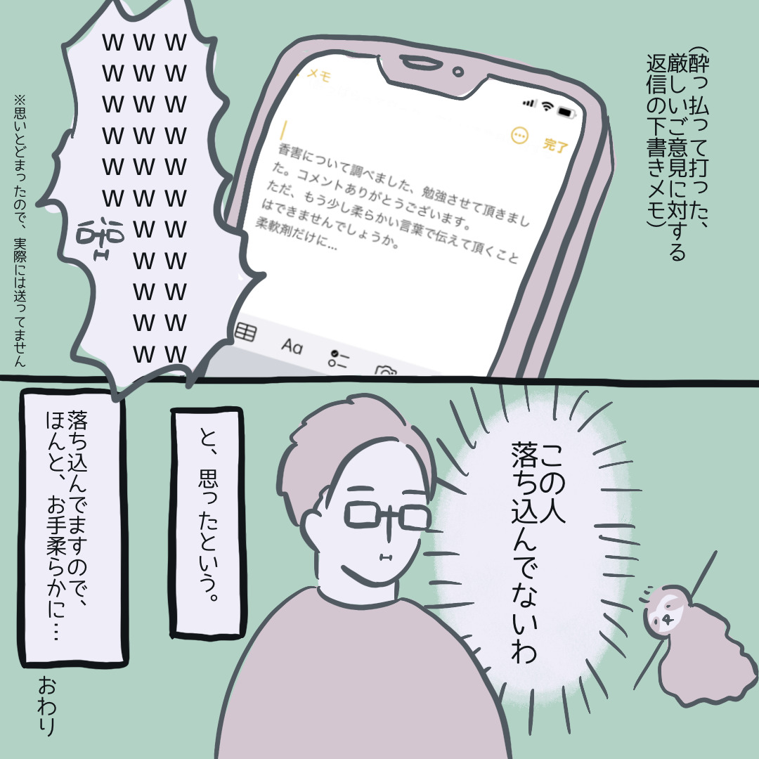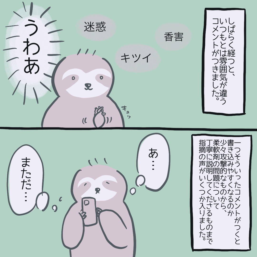 私やむっちゃんの人格を否定されている訳ではないし、いわゆるアンチコメントでもないし、香害は確かに社会問題なので、ついたコメントはそのままにしてあります。