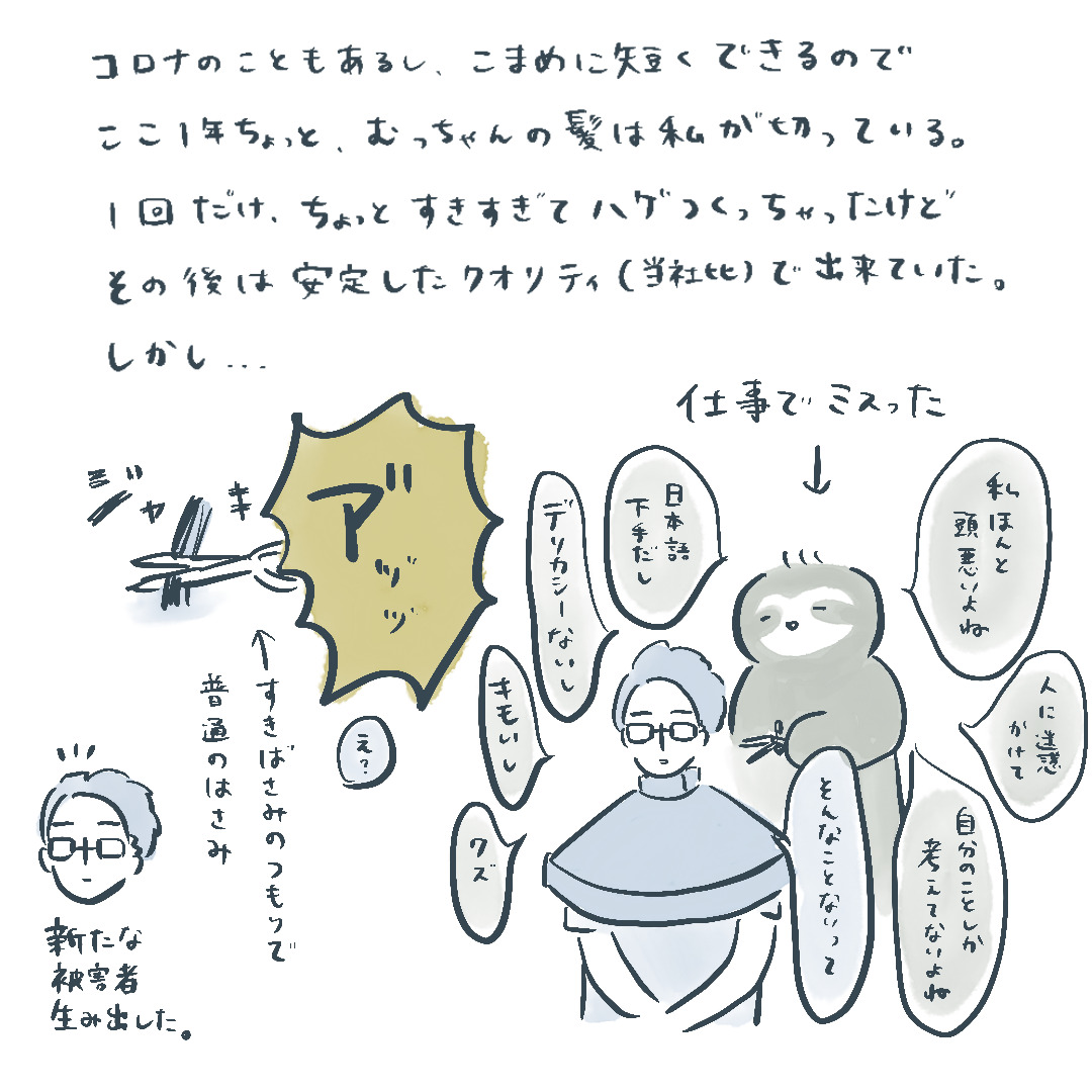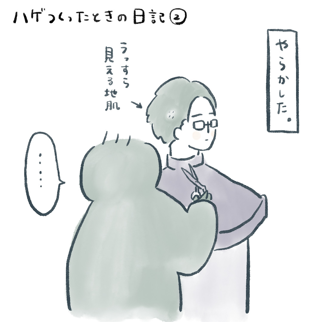 むっちゃんの髪質というか髪型が誤魔化し効くやつなので、セットすれば分からない程度だけどやっちまいました。
